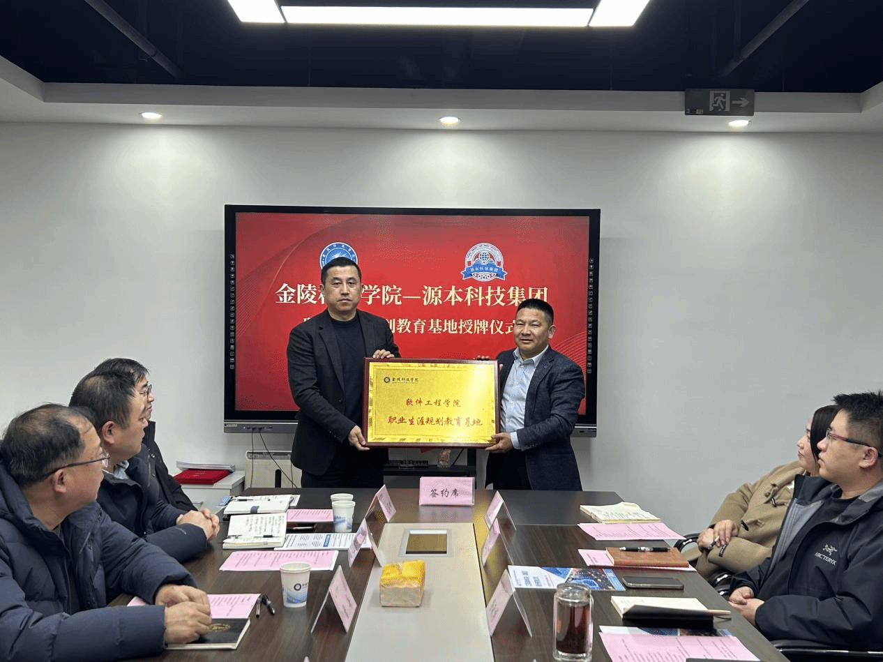 调研团队首先抵达南师大玄武科技园的源本科技总部,在企业相关负责人引导下参观了企业文化墙、校企合作展示区等场所。随后开展交流会,会上双方负责人依次介绍出席人员、致词并介绍企业与学院情况,双方围绕人才供需对接、校企深度合作模式、现有合作回顾与深化及其他潜在合作环节等议题展开深入交流,达成多项共识并,并举行了“职业生涯规划教育基地”、“就业和社会实践基地”授牌仪式。