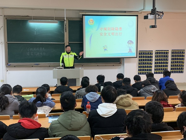 肖警官列举了2018年发生在学生身边的交通事故,以此来唤醒在场同学的交通安全意识。随后他紧紧围绕步行安全,骑车安全,行车安全三个方面的安全问题,就我们面临的交通环境、交通法规、学生经常遇到的交通安全事故以及发生交通事故后应该怎么处理等几方面向同学们详细讲述。肖警官告诫大家不要做“新时代的盲人”,危险随时就会发生,养成具备安全意识的习惯。最后,肖警官向同学们发出“守规则除隐患,安全文明出行”倡议,提醒同学们严格遵守交通规则,文明出行,为营造文明出行环境贡献自己一份力量。