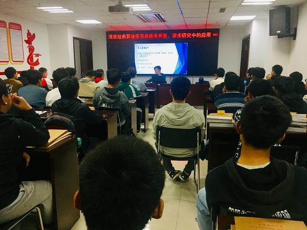 讲座就软件专业的核心即算法展开深入分析、探讨和分享、建议,包括:什么是算法、如何学习算法、算法学习与相关竞赛的关系、算法学习对从事技术开发工作的影响以及算法学习对从事学术研究工作的影响。参加的学生为大四到大一的计算机相关专业,济济一堂,学术氛围浓厚。