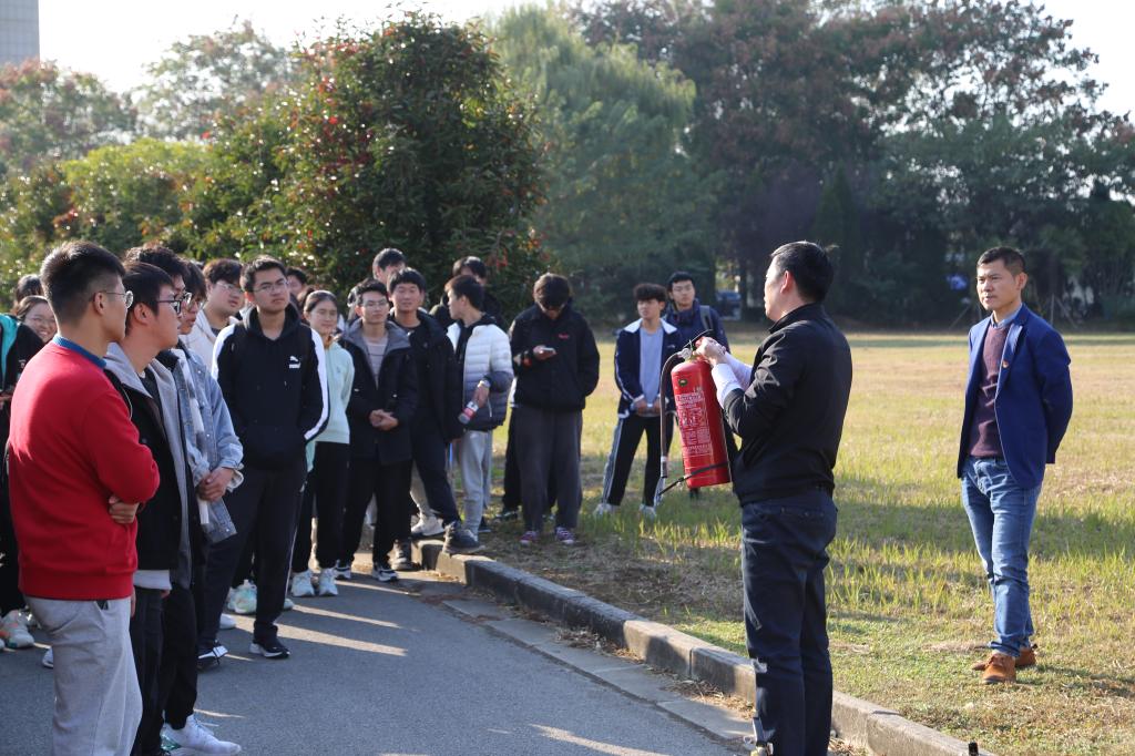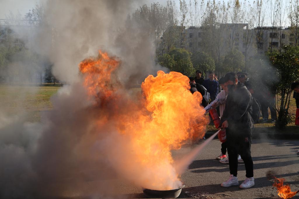 讲座后,卓处长和张理航老师带领同学们来到室外进行灭火器使用操作演练。卓处长向同学们展示了灭火器的使用“提、拔、瞄、压”四步要领后,强调了灭火时必须站在距离起火点5米左右,且要处于上风口,同学们在保卫处老师的指导下进行了灭火器使用的实际操作,成功将火扑灭。