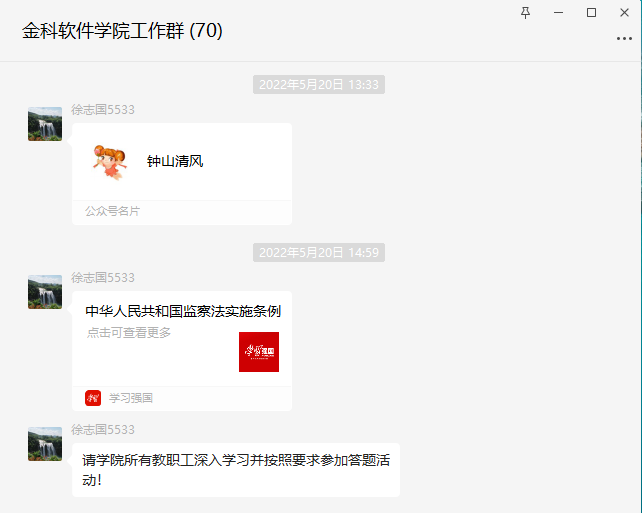 为深入学习贯彻习近平法治思想,落实宪法和监察法要求,推动全院教职工学好用好《中华人民共和国监察法实施条例》(以下简称《条例》),根据校纪委通知在全校范围内开展《条例》学习宣传活动的要求,5月20日,Beat365唯一官方网站积极组织动员全院教职工参加《中华人民共和国监察法实施条例》学习及线上答题活动。