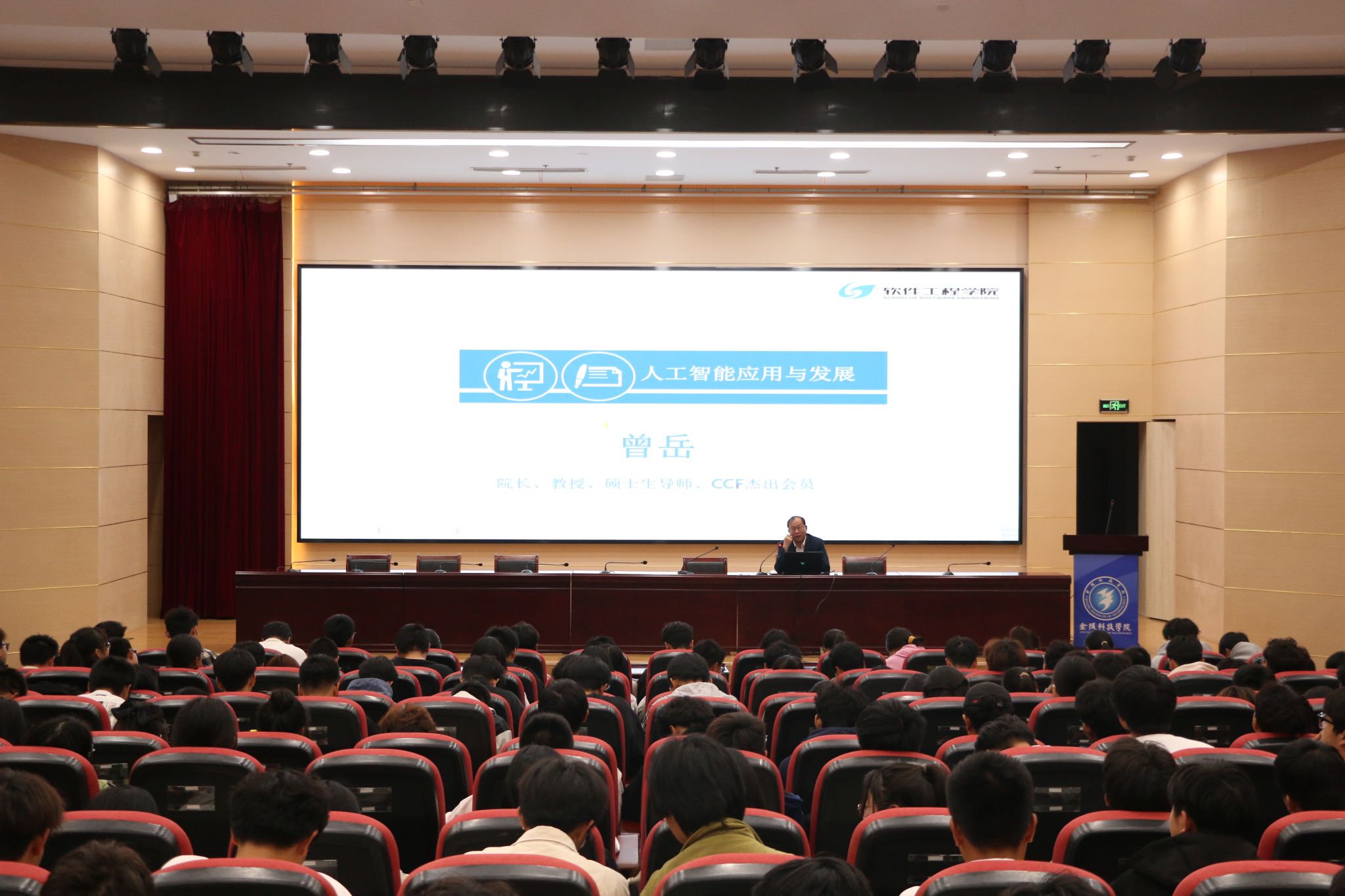 曾岳首先以AlphaGo为对象,介绍了人工智能的深度学习能力,展示了人工智能广阔的发展前景,人工智能目前在王者荣耀中各个方面碾压世界顶级选手。其次,他讲解了计算机的发展背景,图灵机模型是现代计算机的逻辑工作方式的基础,推动了现代人工智能的发展,介绍了在探索开普勒-90星系时用到了卷积网络神经进行推算,以及从近代到现代计算机的发展历程,展示了自己的科研成果(磁导航、二维码导航和激光导航机器人在不同智能工厂的应用场景),掌握技术的主动权和创业市场前瞻性,启发同学们用知识专利进行创业。最后,他强调人工智能的发展前景广大,号召同学们应认真学习专业课程,提升自己的计算机思维,发展编写代码的能力,促进学生的开发代码的创新能力。