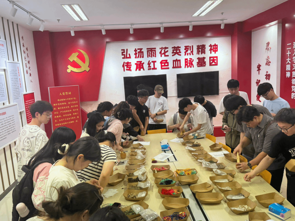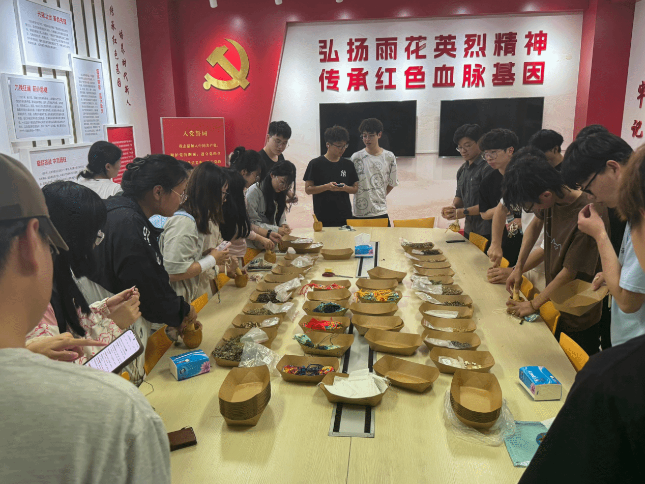 活动现场,长桌上分类陈列着艾草、薄荷、丁香等十余味中药材,以及五色丝线、刺绣荷包等传统材料。同学们围坐长桌,先通过嗅闻辨别草药特性,随后参照《端午香囊古法配方表》自主调配。艾草带着山野的粗粝,薄荷渗出晨露的清凉,丁香凝结晚唐的馥郁......研钵与药杵的碰撞声此起彼伏。书记示范古法研磨技巧:“艾草需顺时针九转,取《周易》‘乾元用九’之意”。同学们发现,粗磨保留草本野性,细研则释放深层芬芳。同学们独创“三叠法”---先碎后细再混合,使药香层次分明。书记在参与制作时表示:“亲手研磨艾草的过程,能深刻感受到先人的智慧与节日的仪式感。”