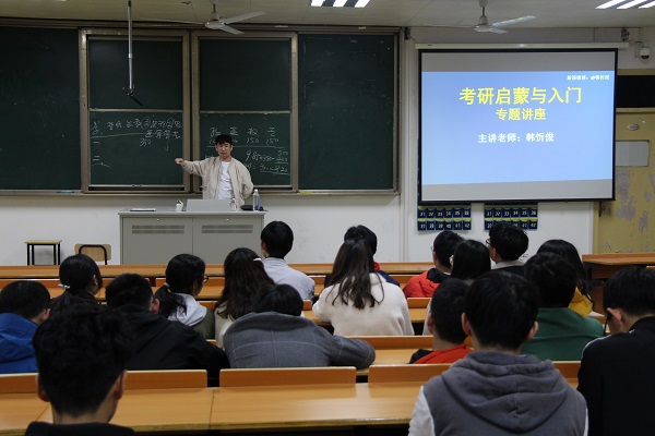 讲座伊始,韩忻俊老师对当前的考研现象进行了大致的分析,用具体的数字形象地帮助同学们了解目前的考研难点,随后又从考研流程、复习规划、专业选择等方面进行详细讲解。韩老师指出,良好的自律性、明确的目标、优秀的团队协作以及合理的未来规划,是考研路上的强大助力,明确这几点,学习起来事半功倍。最后,17级辅导员杜文娟老师提醒同学们应尽早制定考研计划,做好吃苦的准备,只要肯付出就会有收获。