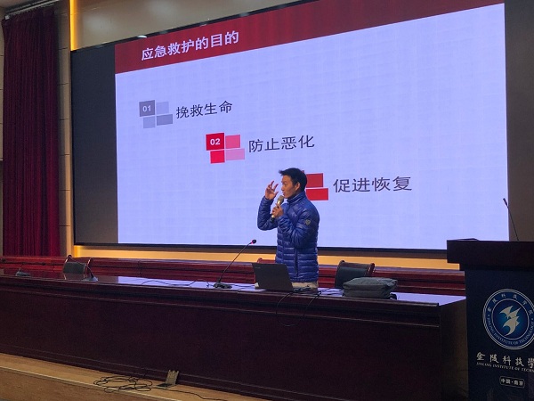 为了增强2020级新生安全突发事故自救知识教育,提高紧急情况自救能力,12月3日,Beat365唯一官方网站在科技楼2号楼报告厅举办心肺复苏急救知识讲座,本次讲座由南京红十字会救护师资库成员、体育部孙浩老师主讲。讲座由孙垒老师主持,新生辅导员张理航、马晓辉及各年级学生干部代表参加。