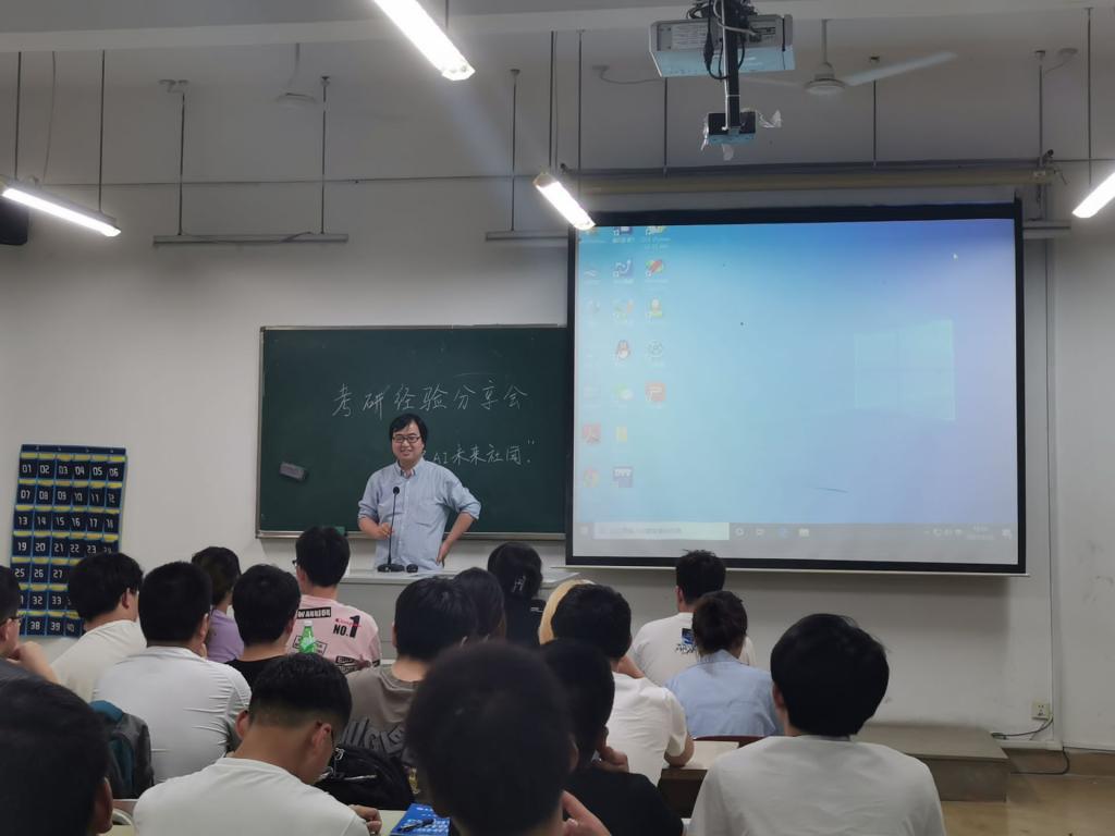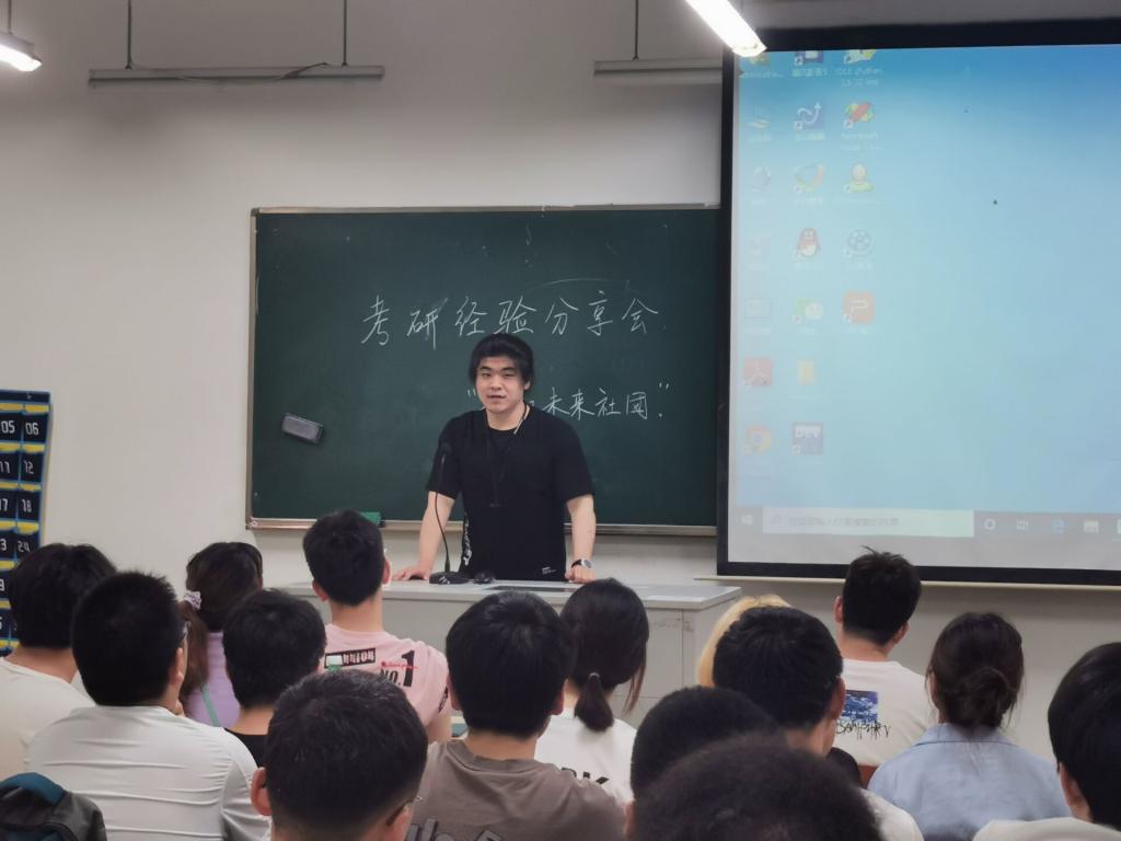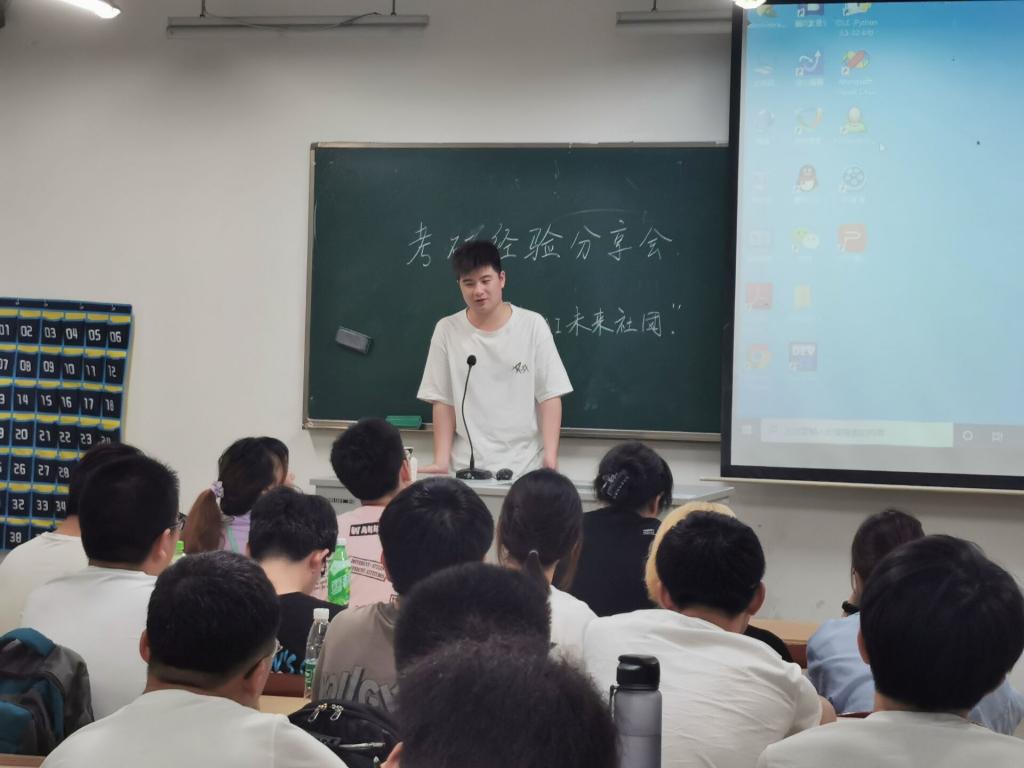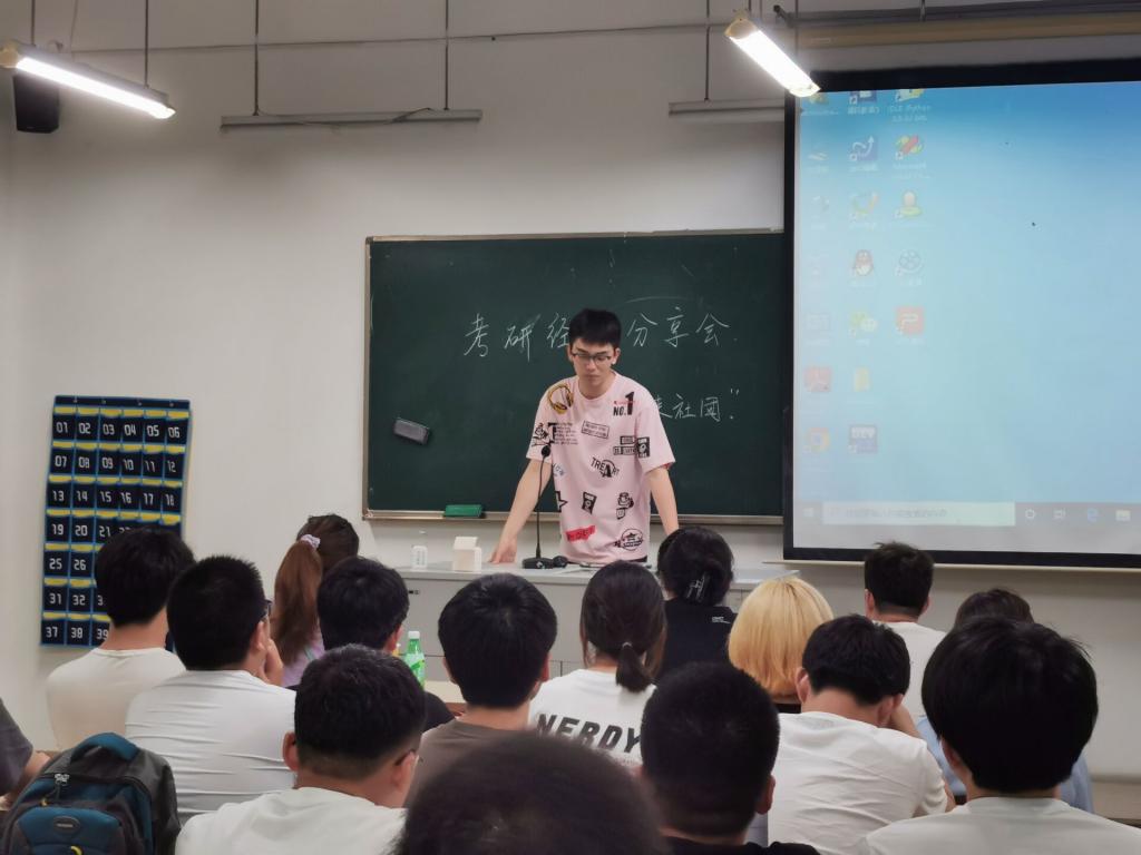 分享会开始,严承旭学长首先了解同学们目前处于的阶段,根据同学们的实际情况,具体就考研现状,考研目的,考研院校的选择,考研是否报班,目前同学们应该做些什么等考研问题做了详细讲解。随后,陈龙学长在严承旭学长的基础上进行了补充,他强调同学们要多跟老师交流,在与老师交流过程中意识到自己问题,进行弥补,进而提升自我能力,特别分享了自己在考研英语方面的经验:多背单词。最后,陈旭东学长建议我们可以寻找一些成功上岸的学长学姐的经验贴,但不能盲目跟从,要根据自身的实际进行调整,可以做一个计划表,要求自己严格按照计划进行,形成一个习惯后,就不会觉得考研是件很难的事。