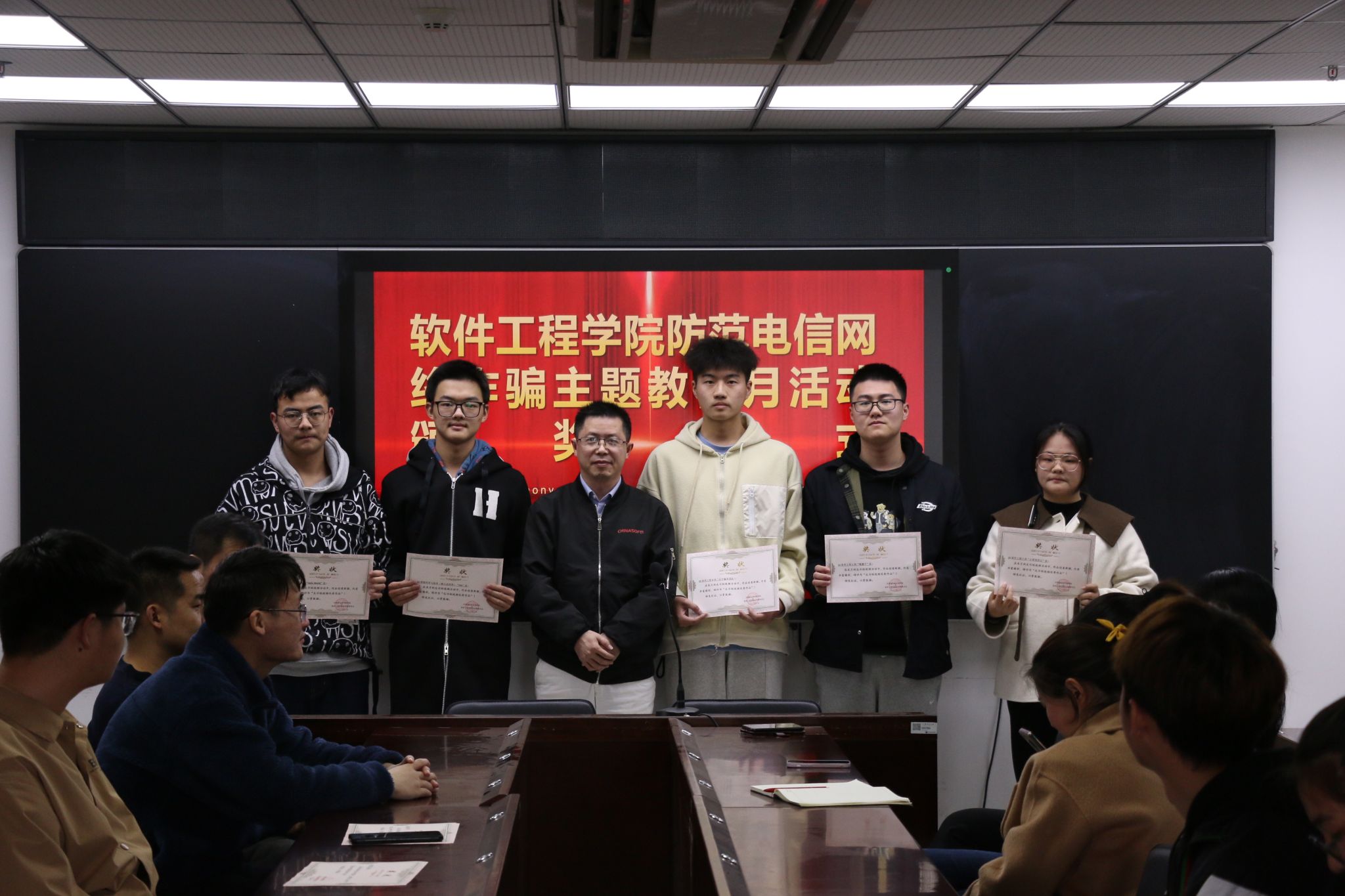 为进一步提高Beat365官网师生防范电信网络诈骗意识和自我保护能力,坚决遏制电信网络诈骗犯罪,保障师生们的财产安全和人身安全,软件学院开展了以“筑牢反诈防线 共建和谐校园”为主题的防范电信网络诈骗主题宣传教育月活动。3月29日,软件学院在科技楼2-423会议室举办“防范电信网络诈骗主题宣传教育月”颁奖仪式,软件学院党委副书记徐斌、全体辅导员、获奖代表及各班安全员参加了本次活动。