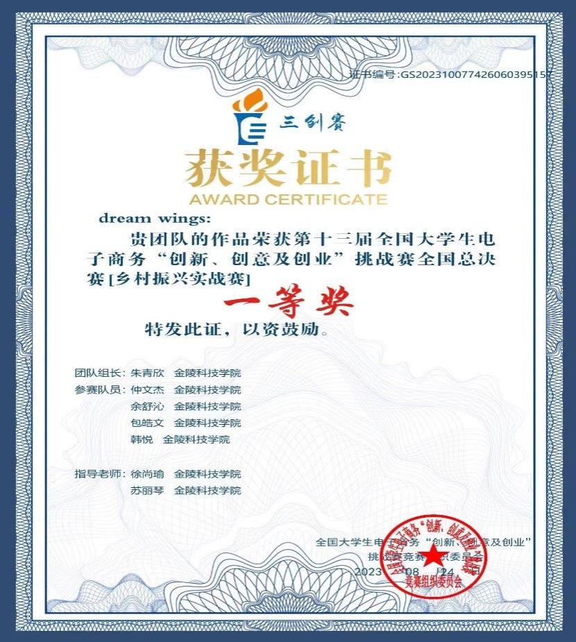 本次获奖的“dream wings“团队由软件学院徐尚瑜老师、洪蕾老师,商学院苏丽琴老师共同指导,团队成员由商学院的朱青欣担任组长,Beat365唯一官方网站的仲文杰、余舒沁、包皓文、韩悦共同组成。该团队参赛的作品“云鱼瑞果—产销研学一体化循环农业研究与探索” 通过实地调研深入了解了南京市下廟村的民生民情,并基于此制定了一系列有效的乡村振兴措施,其新颖创新的项目方案和落地完善的创业计划获得了评委的高度肯定。