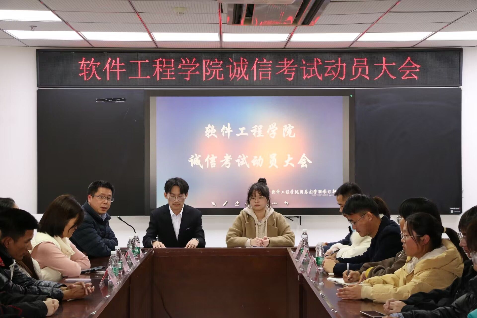 会议伊始,学习部副部长尹妍琳做学院班级学风建设情况汇报,重点强调班级风气和诚信之风在学风建设工作中的重要地位。会议中,徐斌副书记强调诚信对于个人的重要性,他教育引导各班的班长和学委要做好带头表率作用自觉遵守考试纪律,鼓励大家诚信考试。会议末尾,学习部组织现场全体与会学生代表进行了宣誓,并举行学生代表签字仪式。