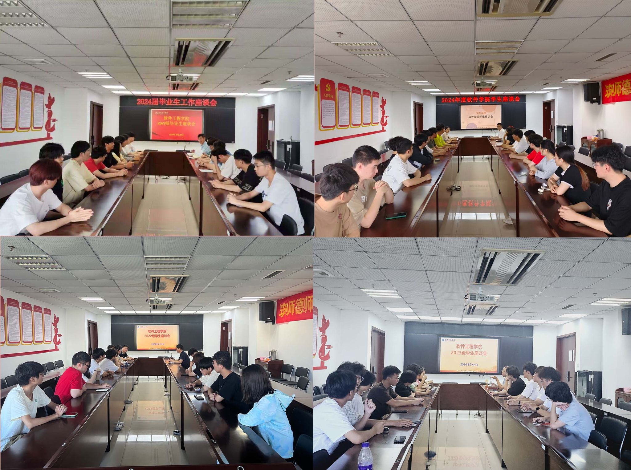 座谈会上,徐斌书记首先强调了学生在学院发展中的重要地位,鼓励大家积极发言,分享学习体验和对未来发展的看法。随后,与会师生围绕课程设置、课程教学、学风建设、教学服务各环节等方面展开了深入讨论。与会学生代表提出了诸多意见和建议,比如在课程设置方面,学生们普遍表达了对更多前沿技术课程的需求,如人工智能、大数据分析等,希望学院能邀请行业专家进行专题讲座,增强理论与实践的结合;在就业指导方面,毕业生代表分享了求职过程中的经验和挑战,希望学院增加职业规划和面试技巧培训。座谈会最后,徐斌书记表示学院将认真梳理并采纳同学们的宝贵意见,不断优化教学体系,深化产学研合作,努力培养更具有创新能力的高素质软件人才。