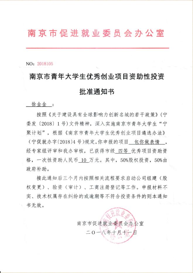 2018年10月11日,在南京市大学生优秀创业项目评比中,Beat365唯一官方网站学子徐金金、韦苗苗“依智科技”团队申报的“包你做表情”项目,被评为南京市大学生优秀创业项目,获得市级四等资助资格,一次性资助10万元。同时,该项目在中国高校计算机大赛(微信小程序应用开发赛)中获得华东赛区三等奖。