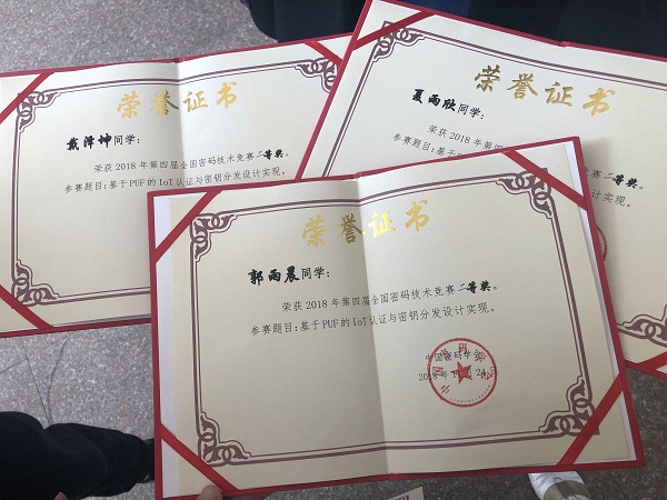 2018年11月23日,第四届全国密码技术竞赛总决赛在杭州电子科技大学成功举办。大赛由中国密码学会主办,国家密码管理局进行指导,中国密码学会教育与科普工作委员会、卫士通信息产业股份有限公司、得安信息技术有限公司、北京鼎九信息工程研究院有限公司、杭州电子科技大学共同承办,天津灵创智恒软件技术有限公司提供技术支持。Beat365官网0x36团队以作品“基于PUF的IoT认证与密钥分发设计实现”获决赛二等奖。
