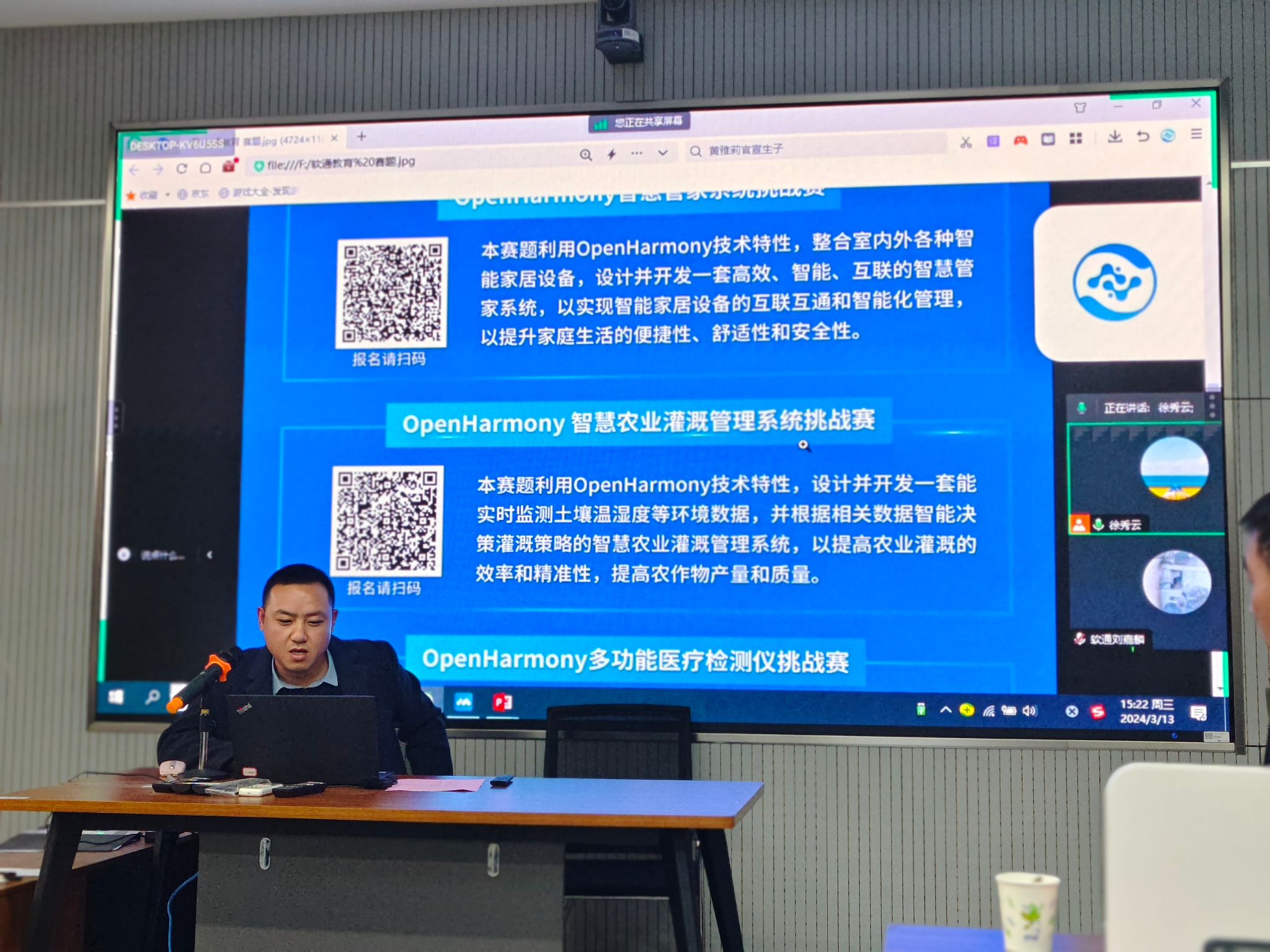 徐永华首先对各位专家的到来表示热烈欢迎,充分肯定了此次活动的意义,并希望同学们能通过此次活动积极主动投入开源,努力提升个人技能。李欣作为鸿蒙项目研发组组长,有着丰富的鸿蒙开发经验,他生动形象且富有感染力的介绍了开源技术及参加竞赛的注意事项,主动吸引和调动了同学们的兴趣,大家纷纷就个人竞赛技能提升、未来自身就业等问题与专家进行了交流和互动。王问骁分享了开源技术学习路线和学生参与开源的方法,并对开源社团活动的开展提出了具体建议。王健为大家介绍了参加竞赛的赛题情况,软通教育大赛负责人刘嘉麟在线上就大家关心的竞赛设备要求等问题进行详细回答和解释。洪蕾对本次活动进行了总结发言,鼓励同学们要积极主动参与到开源技术中来,这对于开源技术的提升和同学们的就业都是一个很好的机会。