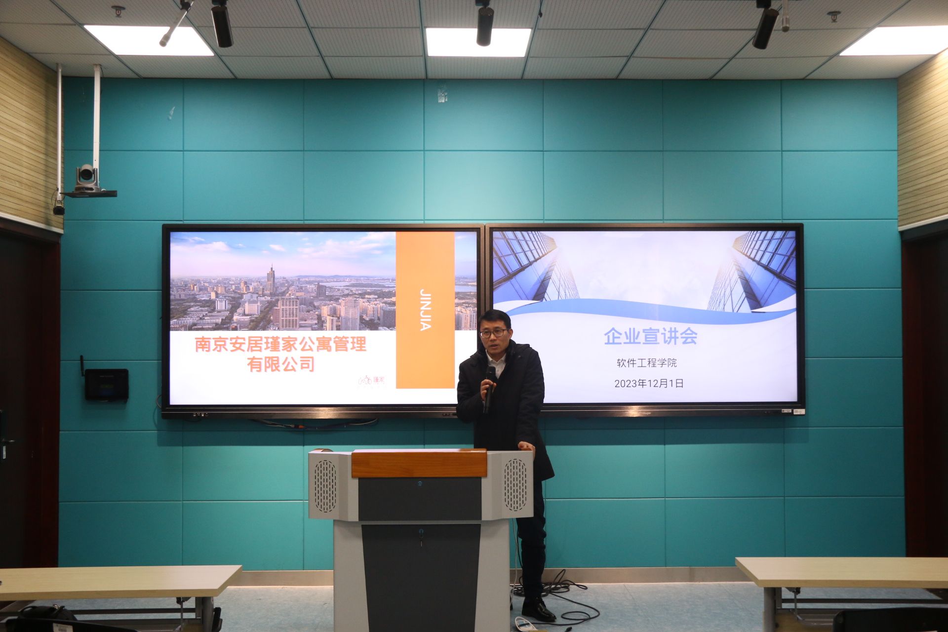 易经理从瑾家的企业背景、瑾家介绍、瑾家荣耀、项目展示和招聘岗位五个方面依次进行介绍,他着重用PPT形式帮助同学们详细了解各个职位的具体情况,讲解公司的职位招聘要求,鼓励同学们根据自身情况积极报名。