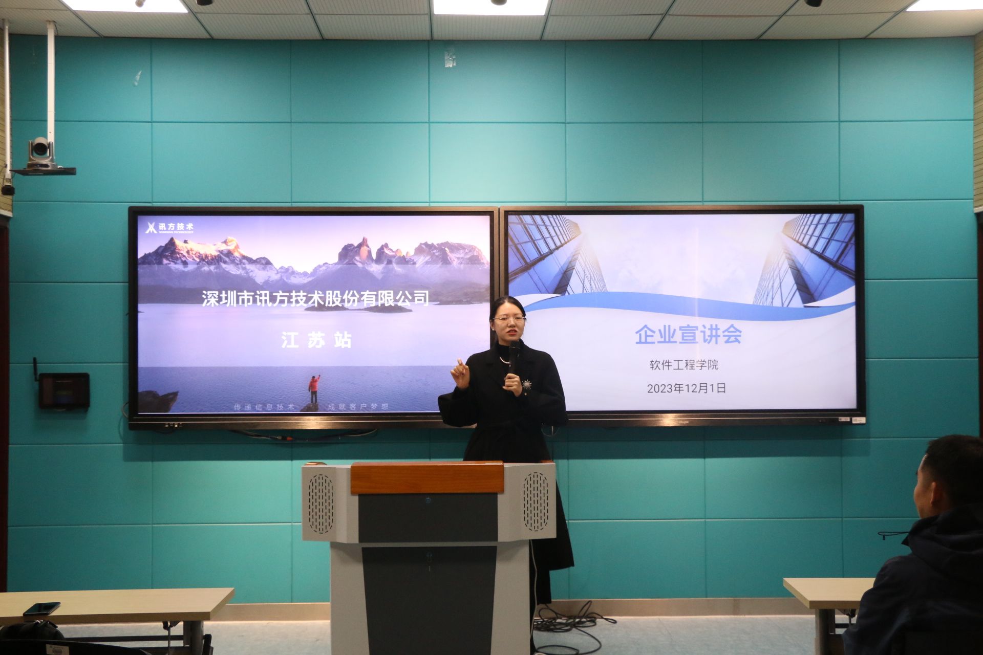 舒经理介绍了讯方技术的企业文化、产品、技术以及未来的发展方向,让同学们对讯方有更全面的了解。她着重讲述了公司中几类岗位的职位形式、招聘要求以及休假情况,希望同学们能够根据自身优势应聘合适的工作岗位。最后她系统梳理了公司的各个职位的薪资待遇,助力同学们进行岗位选择。
