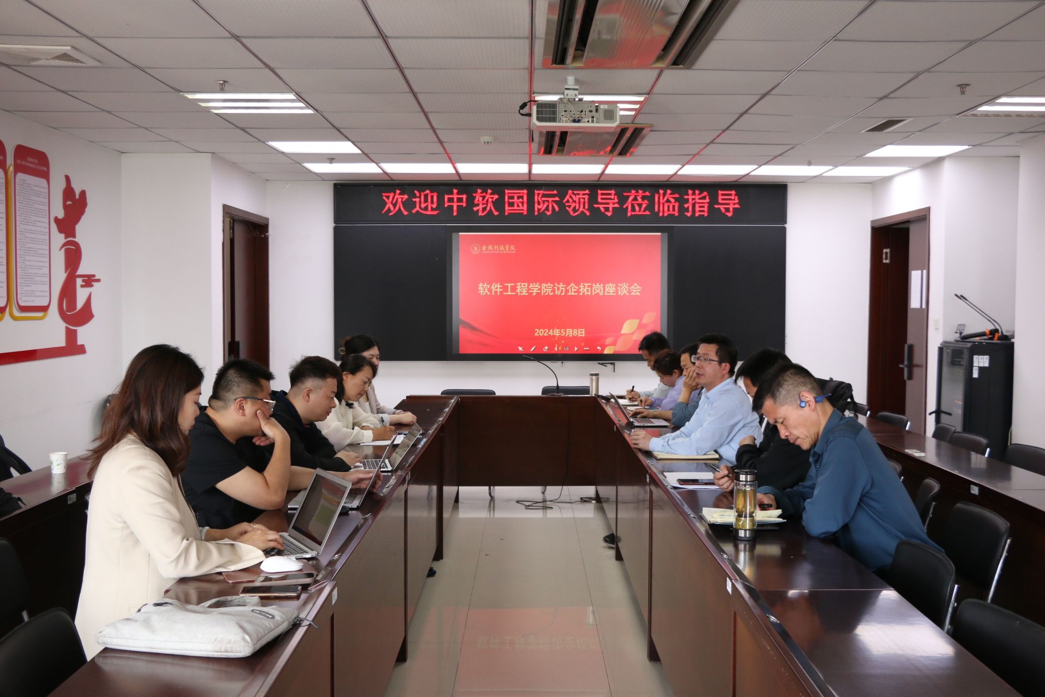 座谈会上,中软国际校园部林经理分析了当前软件行业的就业现状及面临的挑战,介绍了中软国际的人才需求、职业发展路径和针对毕业生的定制化培训项目。王智钢主任详细介绍了学院的教学特色、专业特色及应用型人才培养体系。