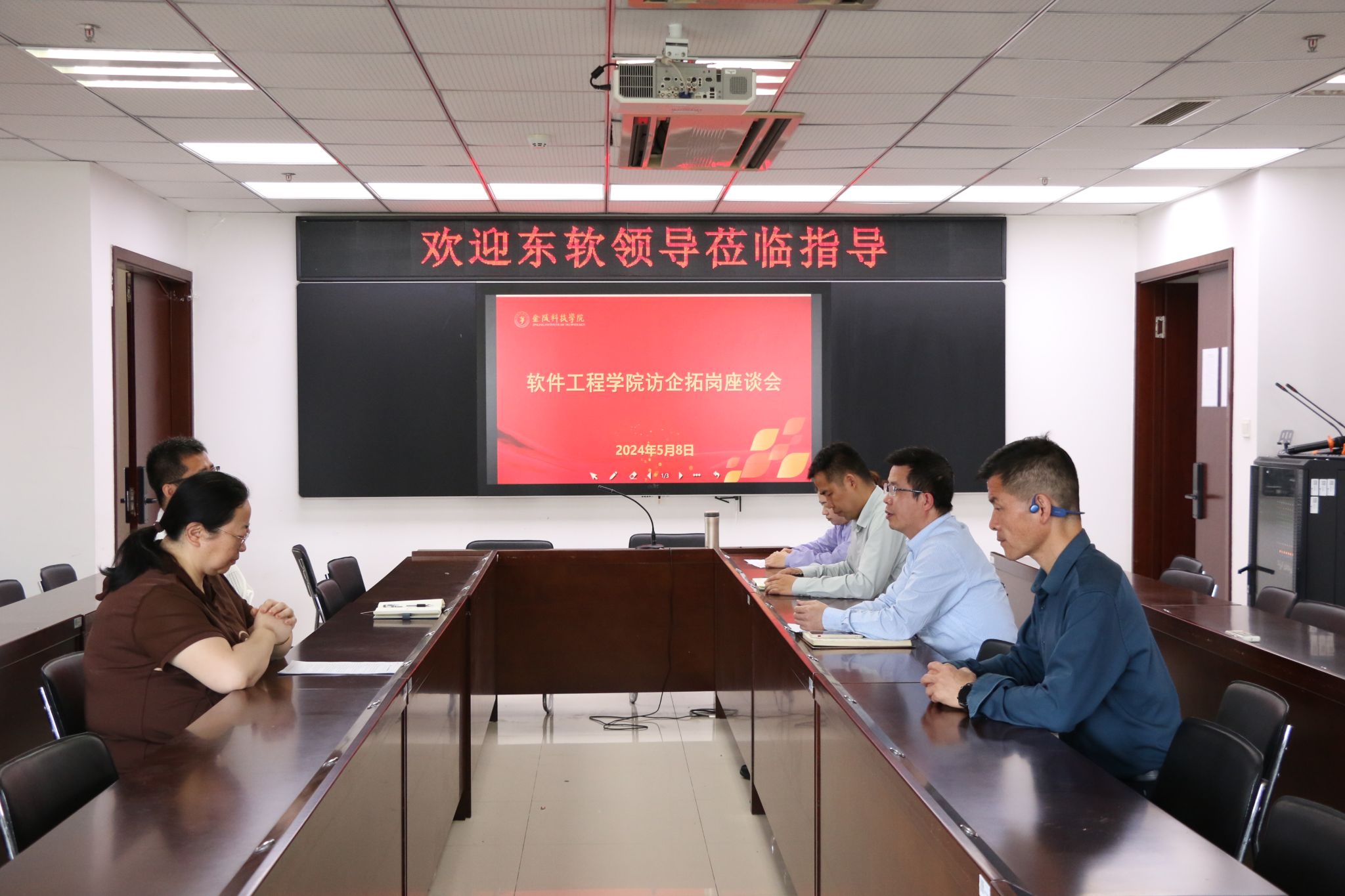 东软集团HR葛经理介绍了今年的招聘岗位计划、公司的人才培养体系和薪资待遇,希望学院推荐更多优质的毕业生加盟东软。洪蕾主任介绍了学院在技术创新、项目实训等方面的最新进展,表达了与东软在联合培养学生、实习实训基地建设等方面深化合作的强烈意愿。