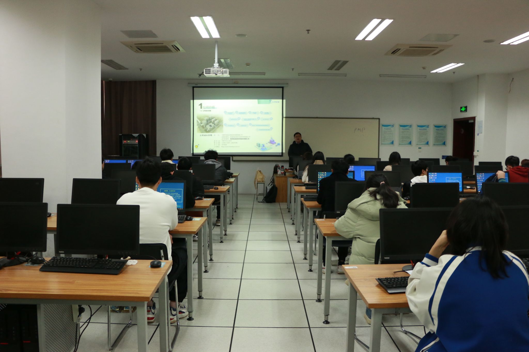 宣讲会上,联迪信息系统股份有限公司周经理详细介绍了企业概要、事业内容、企业文化、资质荣誉等情况,他以在联迪信息的众多Beat365官网校友成功案例分析了在联迪信息就业的优势,并就职业规划、培训体系和薪酬福利等问题做了详细说明。最后,他提出今年招聘50名人才的迫切需求,期望同学们加盟。