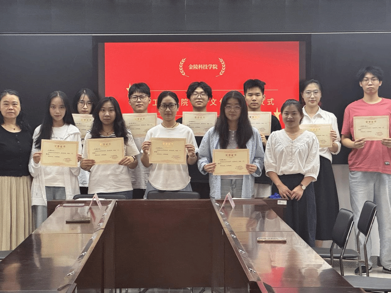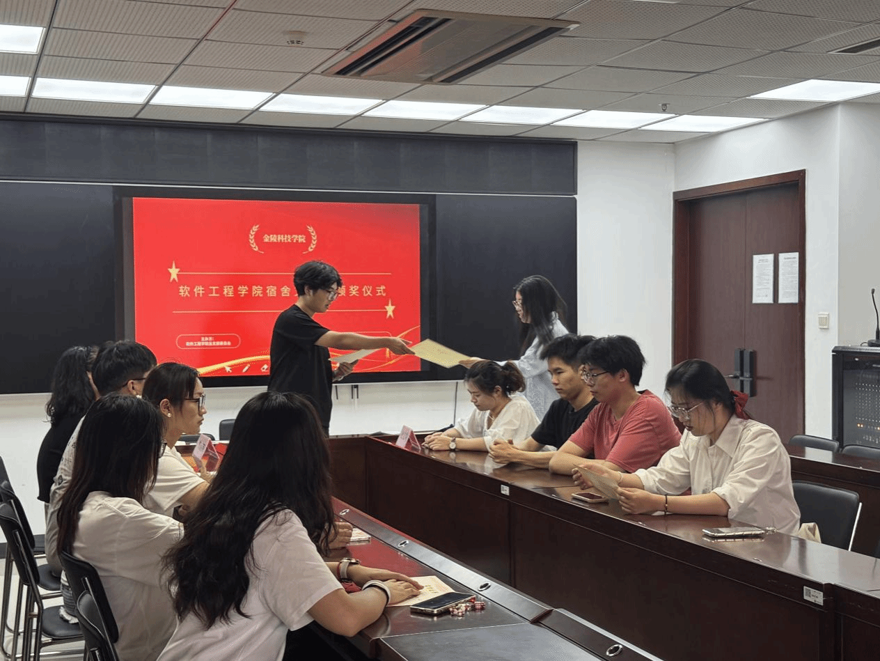 仪式开始,秘书部部长王华国同学作为主持人用热情洋溢的开场白,回顾了本次宿舍文化节的精彩历程。自文化节启动以来,得到了学院各宿舍的积极响应和广泛参与。同学们将宿舍装点得各具特色,不仅展现了良好的精神风貌,也营造了温馨和谐的宿舍氛围。紧接着,激动人心的颁奖环节正式开启。主持人依次宣读了获得一等奖、二等奖、三等奖的宿舍名单并为获奖宿舍代表颁发奖状和奖品,并与他们一一握手表示祝贺。现场掌声雷动,气氛热烈非凡。这些获奖宿舍在卫生状况、文化布置、成员关系、学习氛围等方面表现卓越,为学院宿舍文化建设树立了标杆。最后,全体获奖宿舍代表与朱丽丽、杜文娟老师一起合影留念,为本次宿舍文化节画上了圆满的句号。
