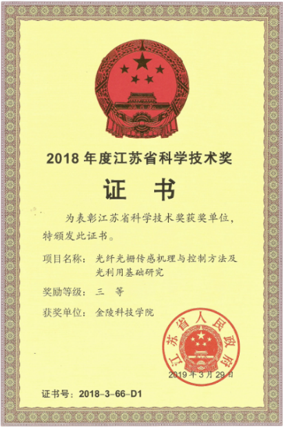 胡兴柳、杨忠,光纤光栅传感机理与控制方法及光利用基础研究,江苏省科学技术奖, 三等奖,2018 年